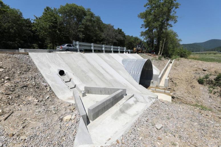 Сейчас рабочие устраивают металлическое барьерное ограждение, укрепляют обочины монолитным бетоном и сеют траву для укрепления откосов земляных сооружений. Ранее они уже заменили конструкции моста, устроили монолитные железобетонные опоры, обновили дорожное полотно, смонтировали систему отвода ливневых вод, восстановили обочину. Основную несущую конструкцию моста сделали из гофрированного оцинкованного материала.