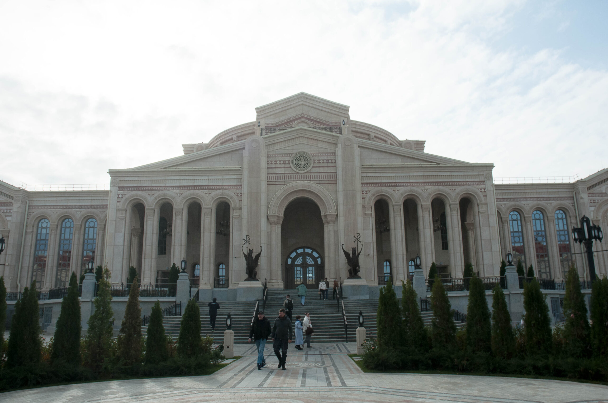 Вход в музей христианства охраняют скульптуры грифонов