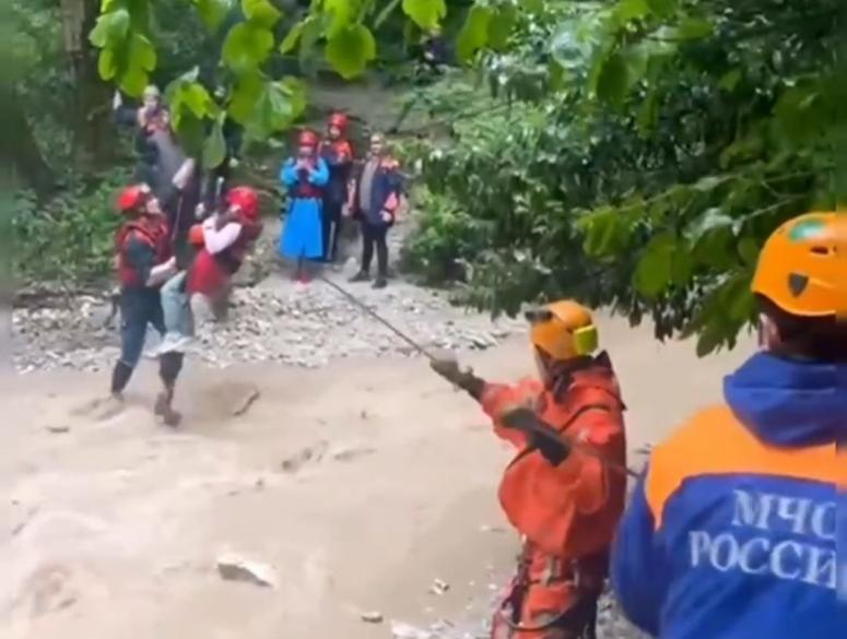 Вброд перейти реку было невозможно. Тогда туристы вызвали спасателей. Сотрудники ЮРПСО организовали навесную переправу и при помощи альпснаряжения эвакуировали трех женщин и ребенка. Мужчинам пришлось все-таки зайти в воду, но спасатели их страховали.