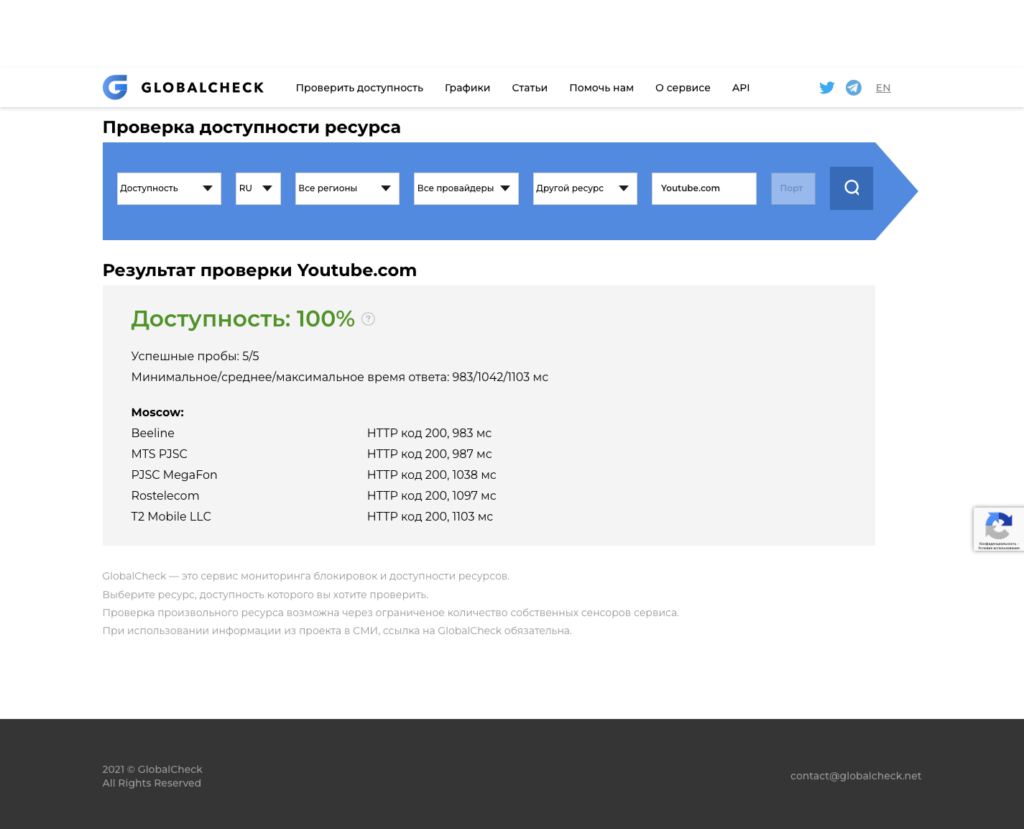 Видеохостинг YouTube без ограничений заработал у большинства крупнейших операторов – «Билайна», Т2, «МегаФона», МТС и «Ростелекома». Таковы данные сервиса GlobalCheck, который отслеживает блокировки и уровень доступности популярных ресурсов.