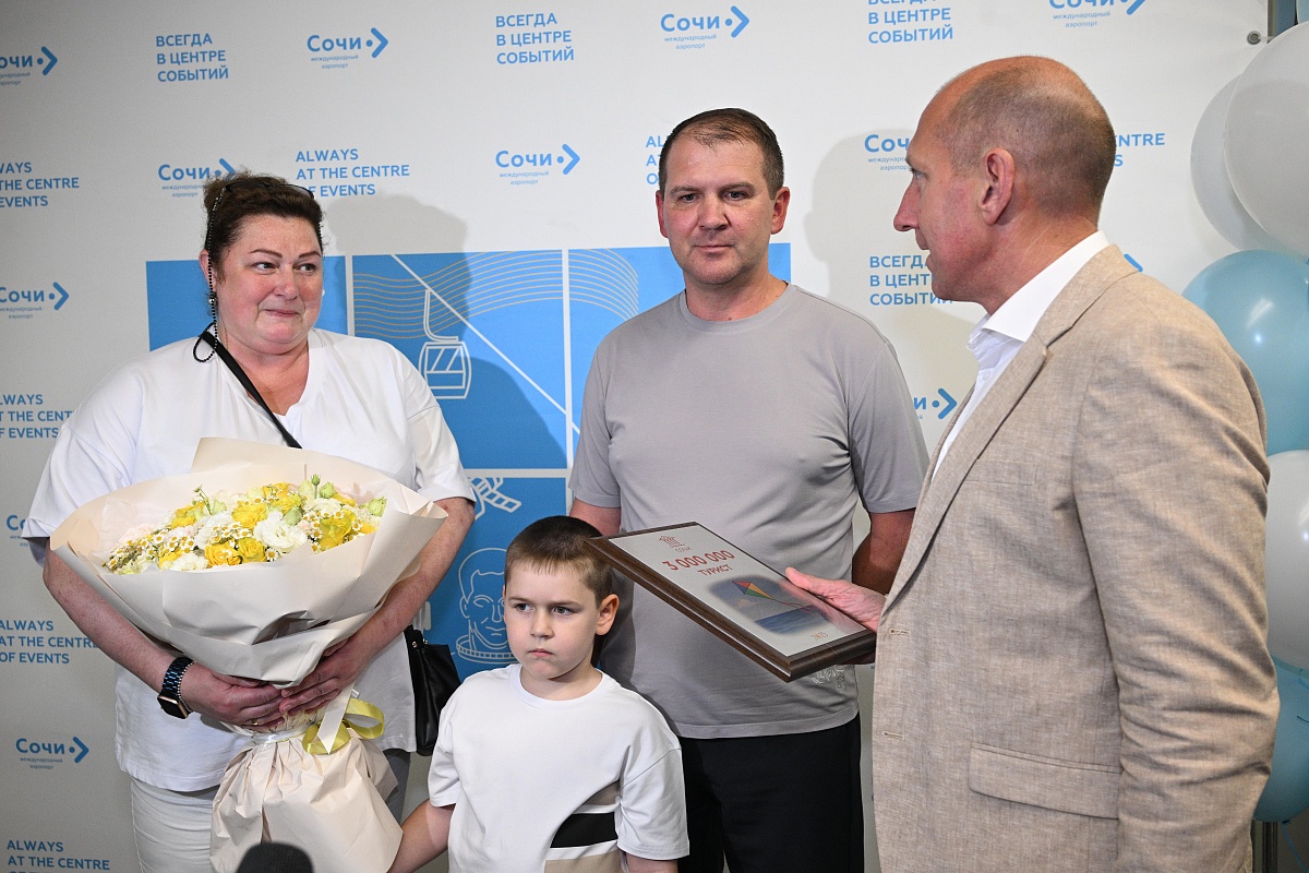 В сочинском аэропорту торжественно поприветствовали трехмиллионного гостя курорта. Им стал москвич Юрий Пирог, который прилетел на черноморское побережье, чтобы провести отпуск со своей женой и внуком. Представители мэрии, руководство аэропорта и отеля, где туристы забронировали номер, поздравили семью и вручили им памятные сертификаты и ценные подарки.