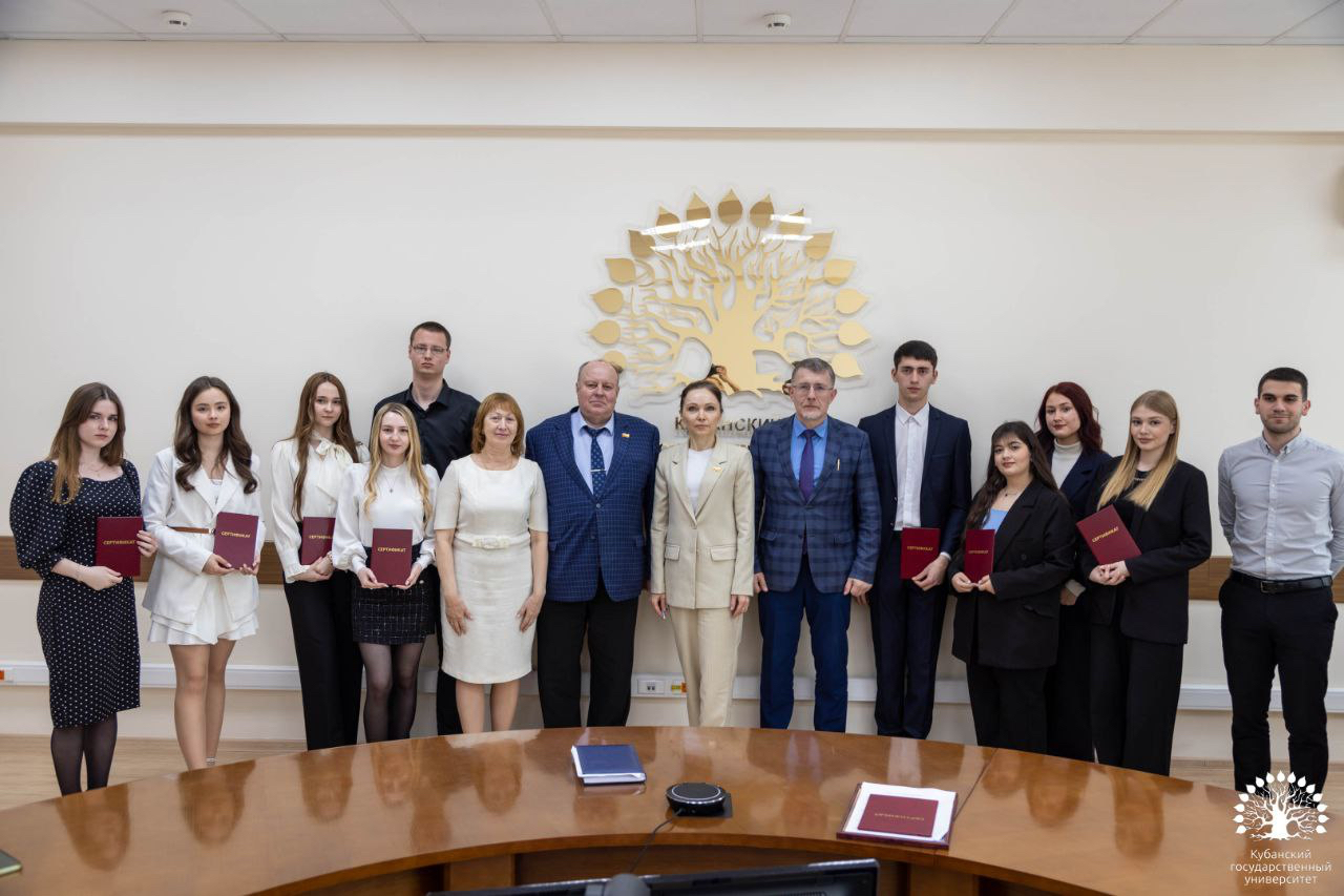 Сертификаты вручены студентам юридического факультета им. А.А. Хмырова Атамановой Яне, Ботанову Дмитрию, Григорян Асмик, Данильченко Василине, Кальновой Милане, Карапетяну Есаи, Колесниковой Еве, Романченко Максиму, Щербаковой Алине, Яковенко Аксинье.