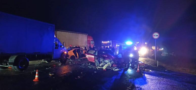Авария произошла в ночь на 8 марта на трассе "Кавказ" в Тихорецком районе Краснодарского края. Столкнулись три легковых автомобиля, один из них, судя по фото, такси.