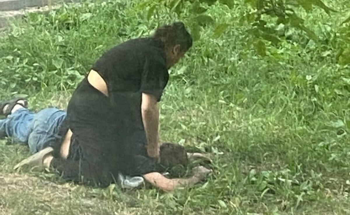 На кадрах (18+) виден лежащий на траве человек, рядом с которым находятся две женщины: одна из них душит мужчину и бьет его камнем по голове, вторая, не вмешиваясь, наблюдает за происходящим. То, что рядом находились дети, агрессоршу не остановило.