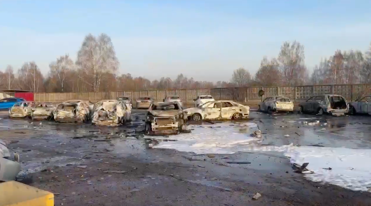 Последствия падения БПЛА на парковку компании «Мираторг» в Домодедово. Кадр из видео / t.me/khrustaleva_domodedovo