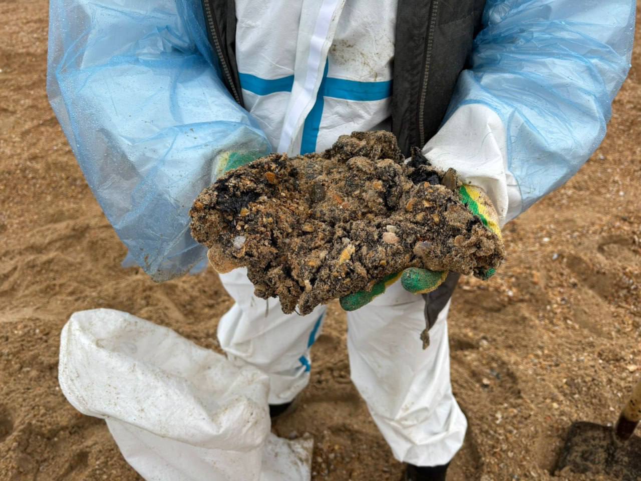Новые участки территорий, испачканные нефтепродуктами, 14 апреля зафиксированы между Витязево и Благовещенской, на центральном пляже Анапы, у санатория «Эллада», возле детского лагеря «Приморский», на пляже в районе устья реки Можепсин.