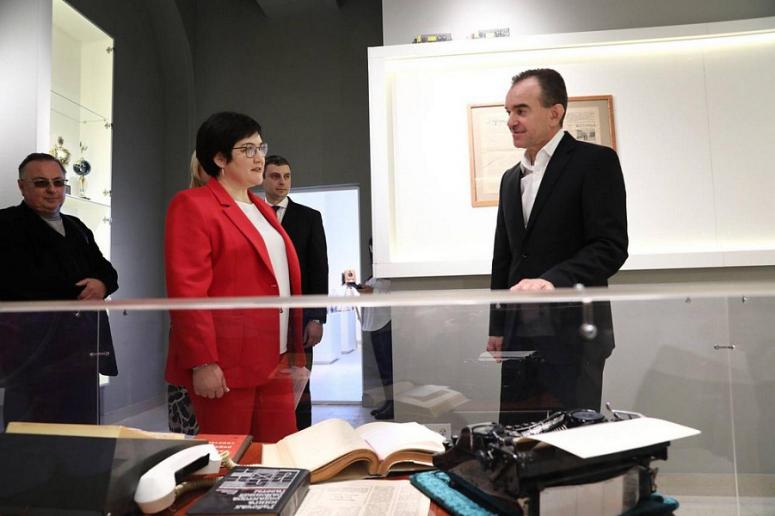 Губернатор осмотрел коворкинг-центр, два зала музея кубанской журналистики, где представлены печатные машинки, радио, газеты, журналы, труды и личные вещи писателя, публициста Виктора Лихоносова, журналиста Владимира Рунова.