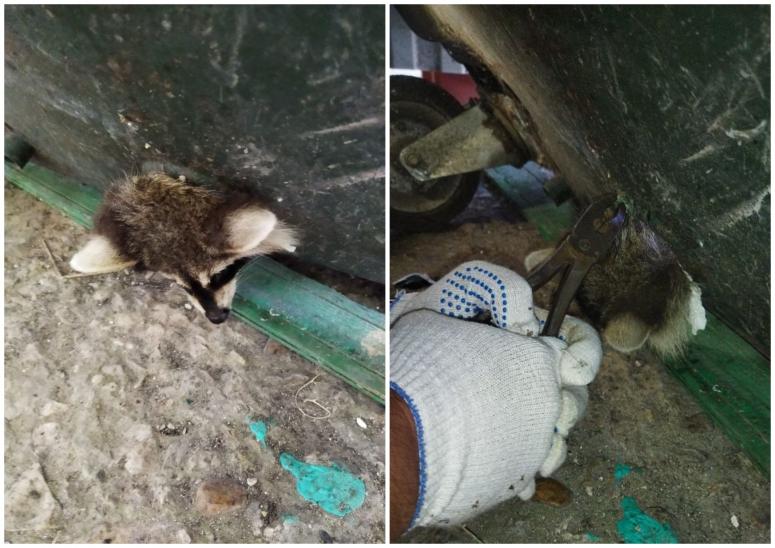 В детский сад в Анапе пробрался енот. Он залез в мусорный бак и застрял в технологическом отверстии. Для вызволения животного пришлось вызвать спасателей.