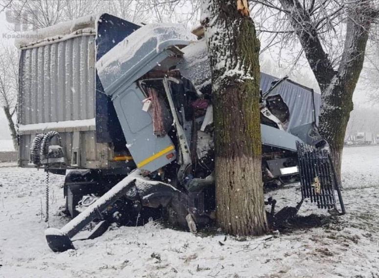 18 января на заснеженной трассе в Каневском районе Краснодарского края погиб водитель грузовика. 46-летний водитель автомобиля МАЗ с прицепом не справился с управлением, съехал с дороги и врезался в дерево. Он скончался на месте аварии.