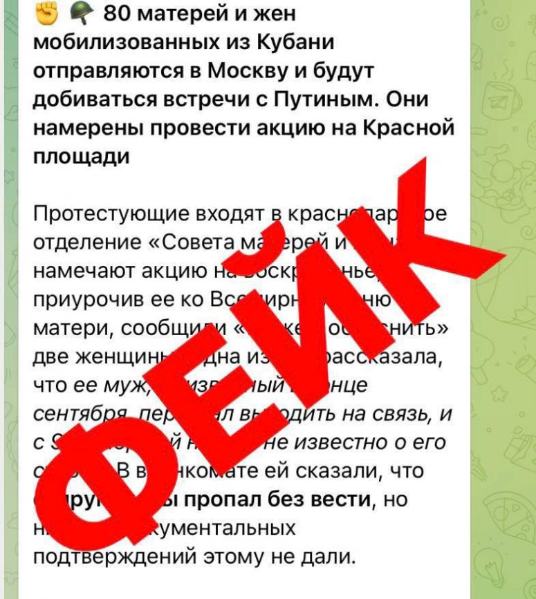 Накануне анонсированной встречи президента России Владимира Путина с родственницами мобилизованных для участия в СВО, которая должна пройти в ближайшее время, в интернете появились сообщения о том, что 80 матерей и жен мобилизованных из Краснодарского края, якобы входящие в Совет матерей и жен, намерены отправиться в Москву, чтобы добиться встречи с главой государства и провести несанкционированную акцию на Красной площади.