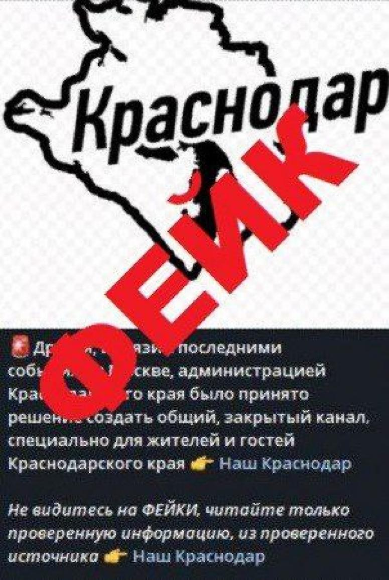 В Telegram-каналах распространяется информация якобы от имени администрации Краснодарского края о создании некого «специального» закрытого канала. При этом злоумышленники спекулируют на трагических событиях в подмосковном «Крокус Сити Холле».