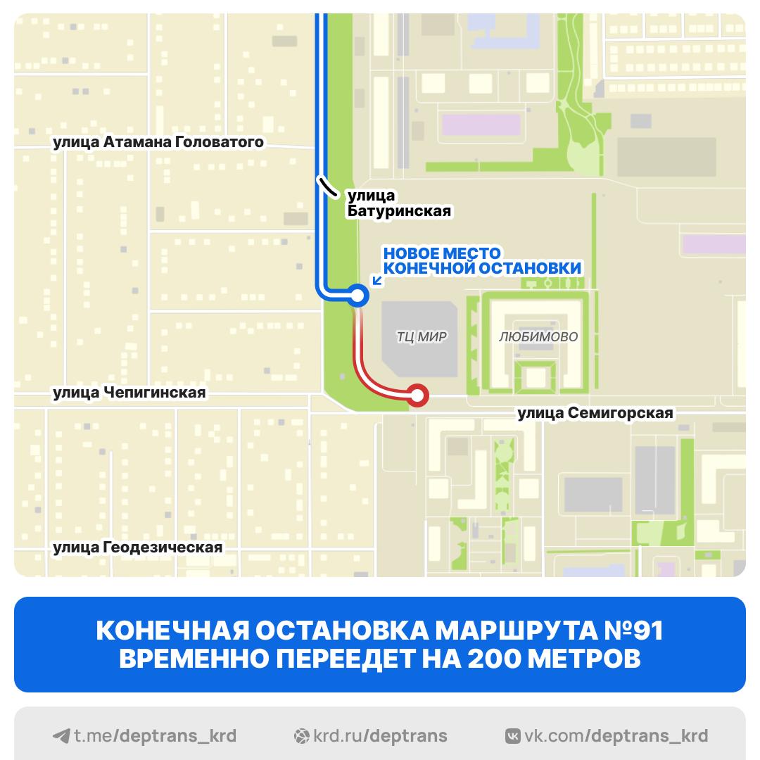 С 24 сентября в краевом центре изменится схема движения автобуса № 91. В районе торгового центра «Мир» начнутся работы по устройству инженерных сетей и благоустройству территории. Из-за этого конечная остановка маршрута, расположенная на улице Семигорской, будет временно закрыта.