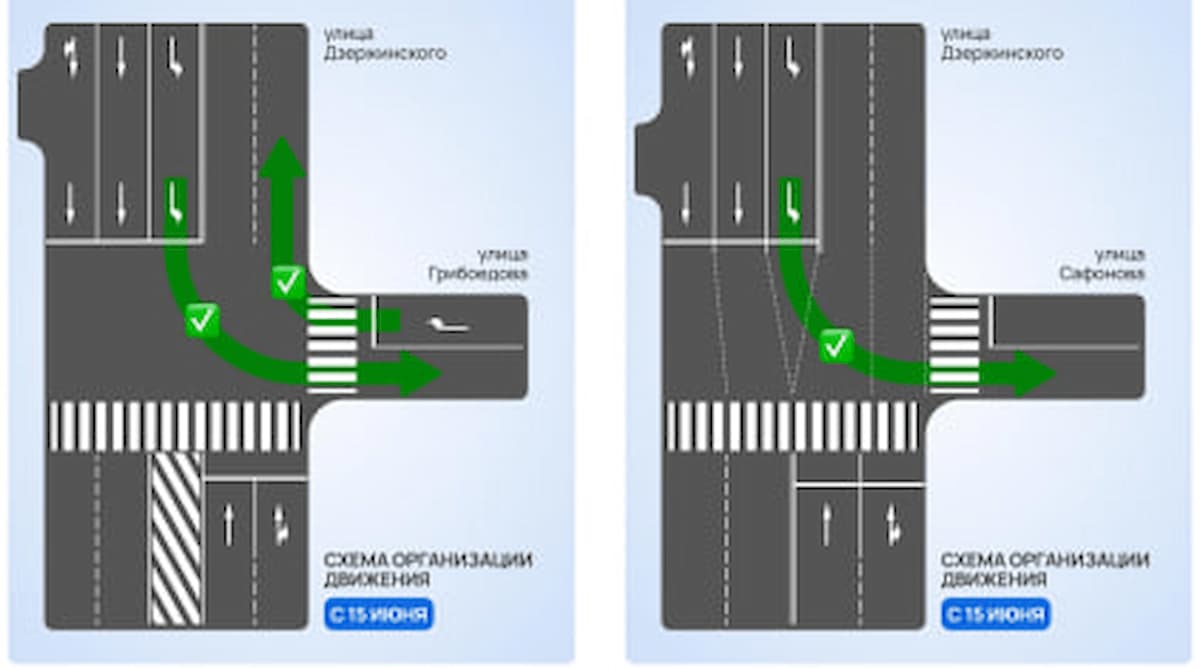 На перекрёстке Дзержинского и Грибоедова водители, движущиеся в сторону центра, получат дополнительную крайнюю левую полосу, предназначенную для поворота на улицу Грибоедова. При этом выехать с Грибоедова на Дзержинского теперь можно будет только направо — в сторону торгового центра «Красная Площадь».