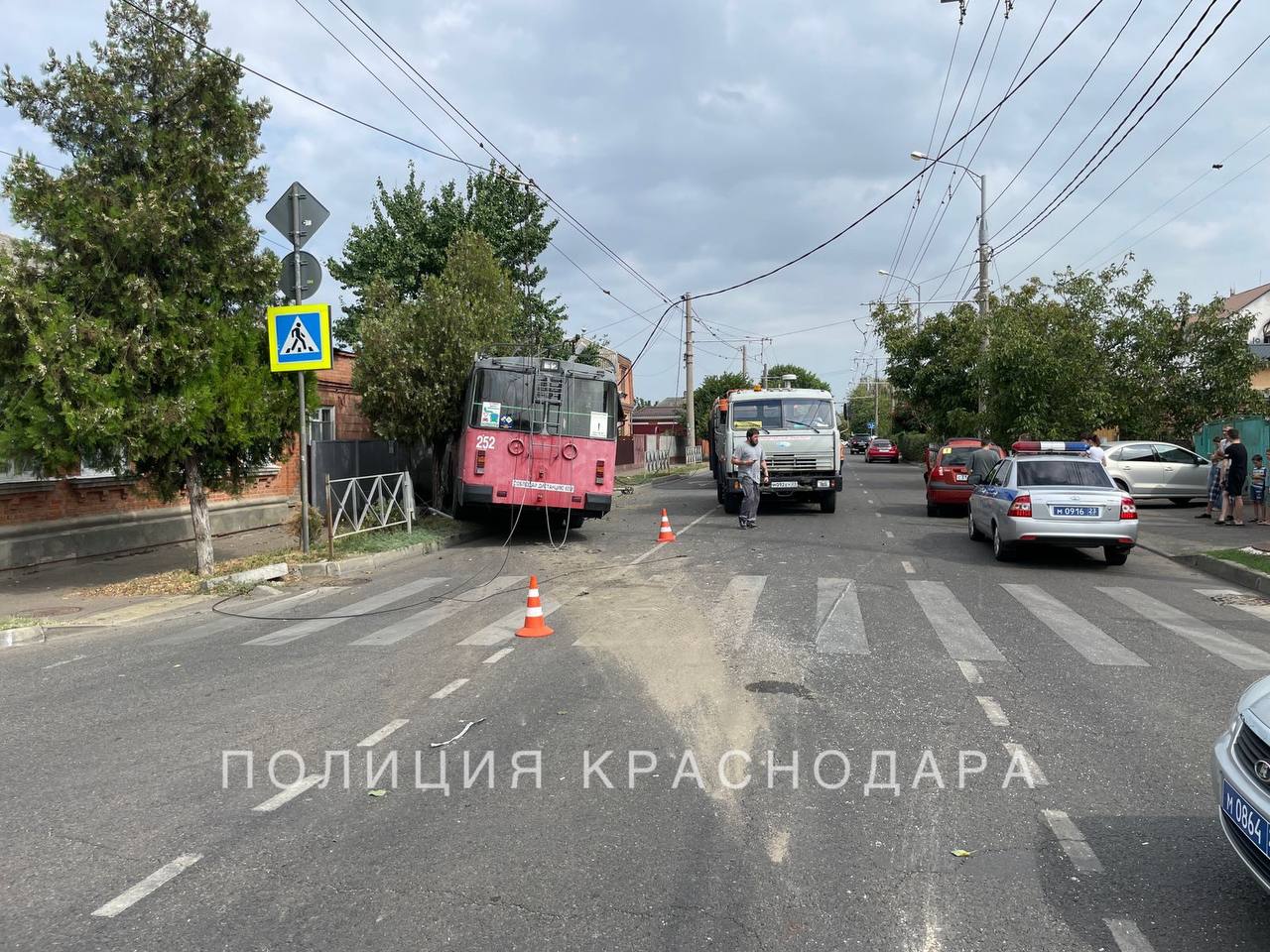 От удара потерявший управление троллейбус врезался сначала в бордюр, а затем в металлическое ограждение, в опору электросети и в дерево.