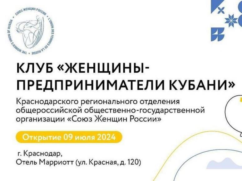 Во вторник, 9 июля, в Краснодаре пройдёт открытие клуба «Женщины-предприниматели Кубани» Краснодарского регионального отделения Общероссийской общественно-государственной организации «Союз женщин России». Мероприятие состоится в гостиничном комплексе «Марриотт» на улице Красная, 120. Вход свободный.
