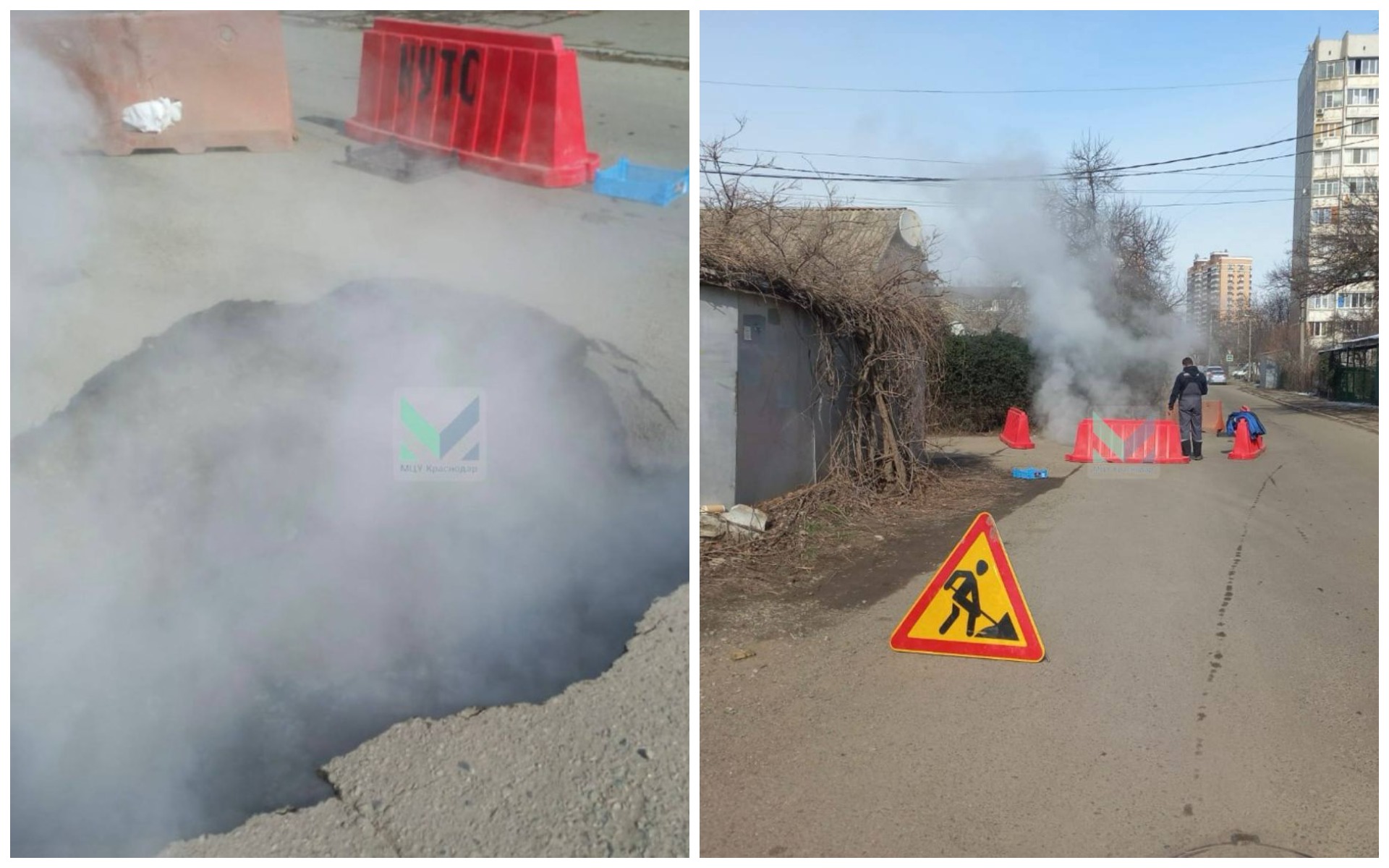 Специалисты АО “Краснодартеплосеть” выяснили, что грунт провалился из-за прорыва трубы, пролегающей на глубине 1,5 метра.