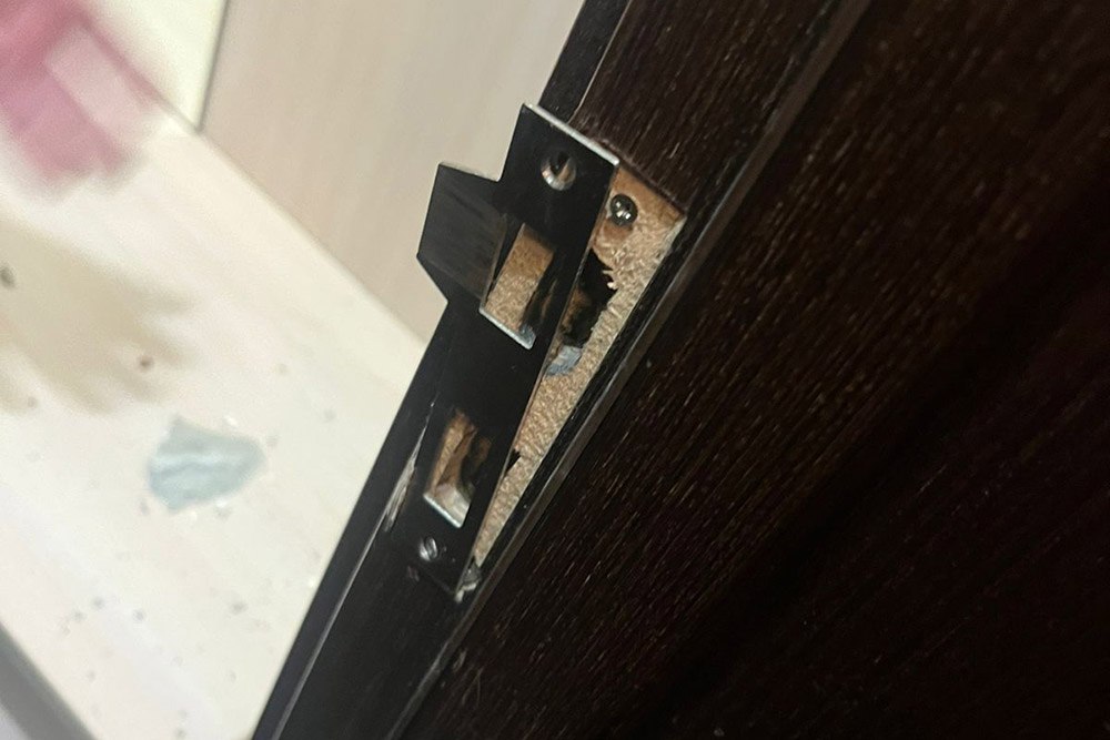 Ситуация стремительно накалялась: нетрезвая гостья решила проникнуть в свободный номер на втором этаже. Не сумев открыть дверь, она принялась её выбивать. В результате дверное полотно оказалось серьёзно повреждено, пострадала и часть стены рядом со входом в помещение.