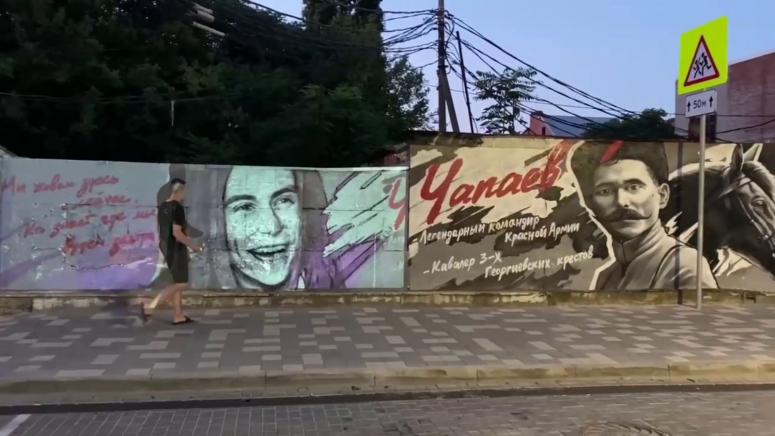 В Краснодаре на улице Чапаева снова нарисовали портрет певца Децла, закрашенный в ноябре 2022 года. Граффити расположено рядом с муралом, на котором изображен начальник дивизии Красной армии Василий Чапаев.