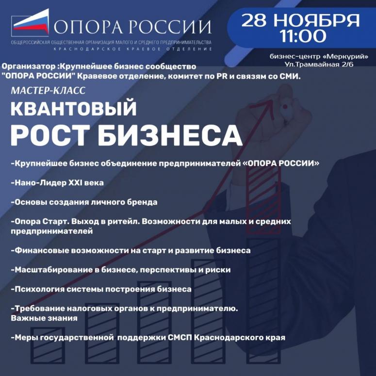 28 ноября состоится просветительское мероприятие для предпринимателей Кубани. В рамках мастер-класса «Квантовый рост бизнеса» участникам расскажут не только о всевозможных мерах государственной поддержки, но и помогут разобраться в некоторых инструментах продвижения бизнеса, что актуально в условиях перекрытия многих рынков сбыта, связанного с геополитической обстановкой. Организатором мероприятия выступает Краснодарское отделение «Опоры России» при поддержке Фонда развития бизнеса и Фонда Микрофинансирования Краснодарского края.