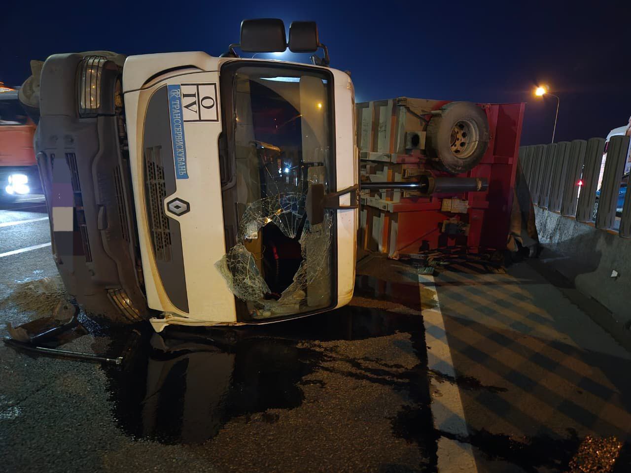 Во время движения у грузовика, везшего песок, лопнуло колесо. Водитель не справился с управлением, большегруз перевернулся, задев бетонные ограждения.