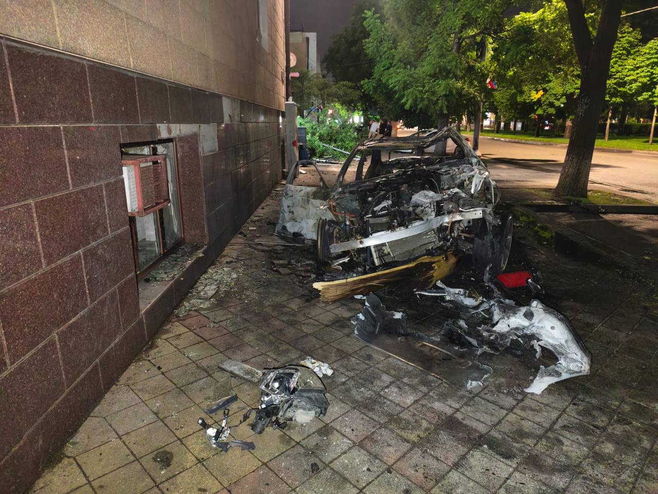 От удара Mercedes вылетел с дороги, наехал на бордюрный камень, стойку дорожного знака, дерево и врезался в фасад здания. Автомобиль загорелся.