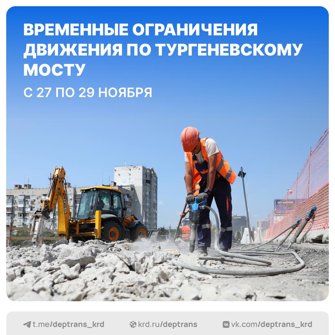 С 7 часов утра 27 ноября до 7 часов вечера 29 ноября на полосе Тургеневского моста, ведущей из Адыгеи в Краснодар, будут демонтировать железобетонные балки. Для того чтобы рабочие безопасно справились с этой операцией, требуются ограничения движения транспорта. Они будут кратковременными — каждая задержка продлится не более 10 минут, сообщили в городском департаменте транспорта и дорожного хозяйства.
