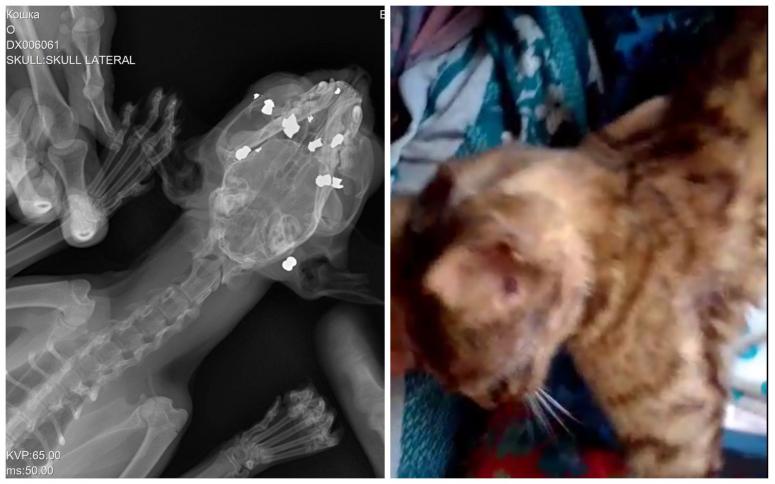 Кошку отвезли в Краснодар на обследование. Ей сделали рентген головы и обнаружили там множество пуль. После того как кошка наберет необходимый вес, ей проведут операцию по извлечению пуль.