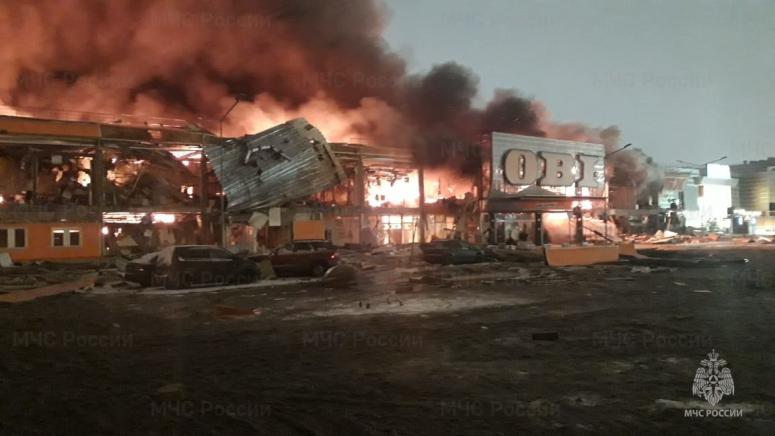 Здание полностью уничтожено огнём, крыша обрушилась на площади в несколько тысяч кв. метров. Тушение затрудняют взрывы внутри здания: предположительно, это взрываются банки с краской и аэрозоли в строительном магазине.