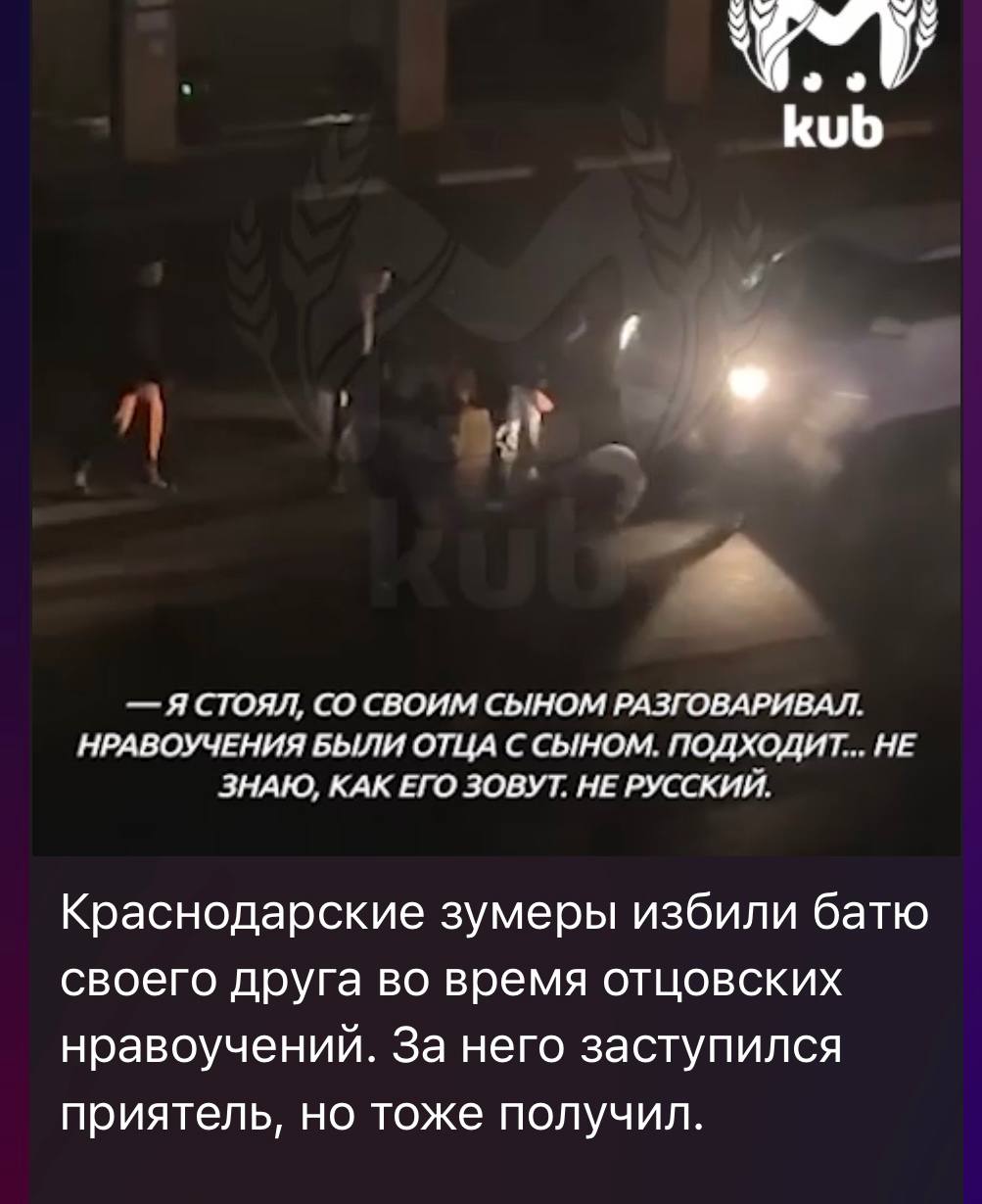 Как сообщает Telegram-канал Kub Mash, индицент начался с того, что на мужчину, отчитывавшего несовершеннолетнего сына, внезапно напала толпа молодых людей (по-видимому, это были друзья сына) и начала избивать.
