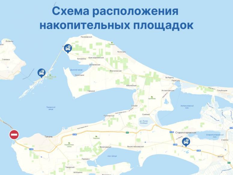 Две накопительные парковки для автотранспорта находятся в поселке Ильич. Еще одна — в станице Старотитаровской. Их общая вместимость — около тысячи машиномест. Площадки расположены вблизи Керченской переправы.