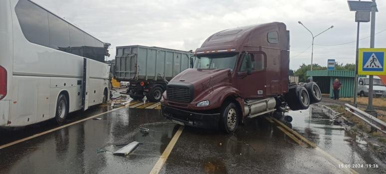 На фотографиях, сделанных очевидцами, видно поврежденный КамАЗ и пассажирский автобус. В комментариях пишут, что, возможно, есть погибшие.