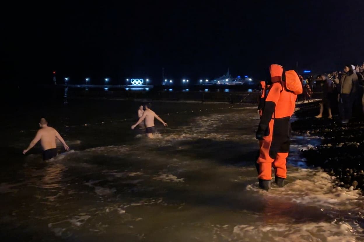 Минувшей ночью в Сириусе крещенские купания не разрешили провести в море из-за шторма. Но на берегу служители церкви организовали молебен, священник закидывал привязанный к запястью крест в волны.