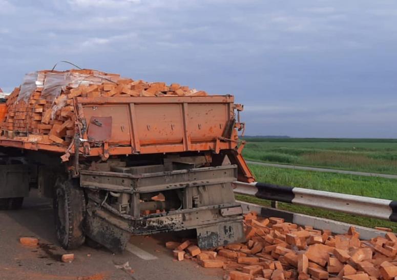 На дорогу из кузова одного из грузовиков высыпалась груда кирпичей.