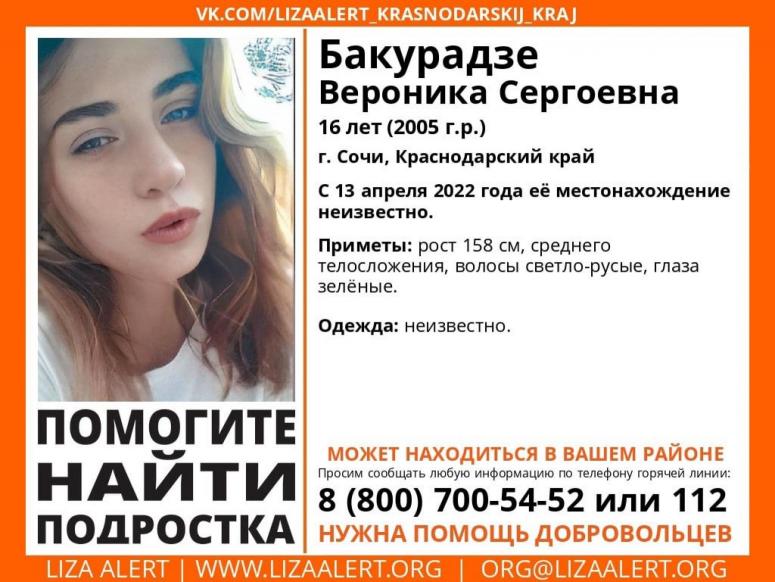 В Сочи девять дней назад пропала 16-летняя Вероника Бакуразде. 13 апреля она вышла из дома и не вернулась. Информация о поиске девушки размещена в поисковом отряде “Лиза Алерт”.