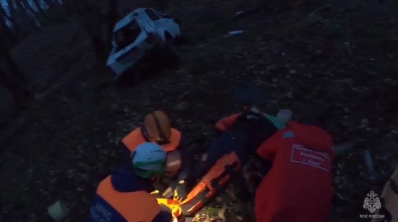 Машина находилась в 60 метрах от дороги. Двое людей из нее — мужчина и женщина — во время падения вылетели из автомобиля, но серьезных травм не получили. Спасатели отметили, что от них исходил сильных запах алкоголя. Мужчина мог сам ходить, женщину подняли к дороге на носилках.