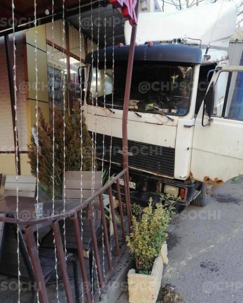 Дорожное происшествие с участием грузового автомобиля MAN произошло днем 20 марта. По свидетельству очевидцев, большегруз, ехавший в сторону поселка Дагомыс, спускаясь с Мамайского перевала, внезапно потерял управление и въехал в придорожный магазин.
