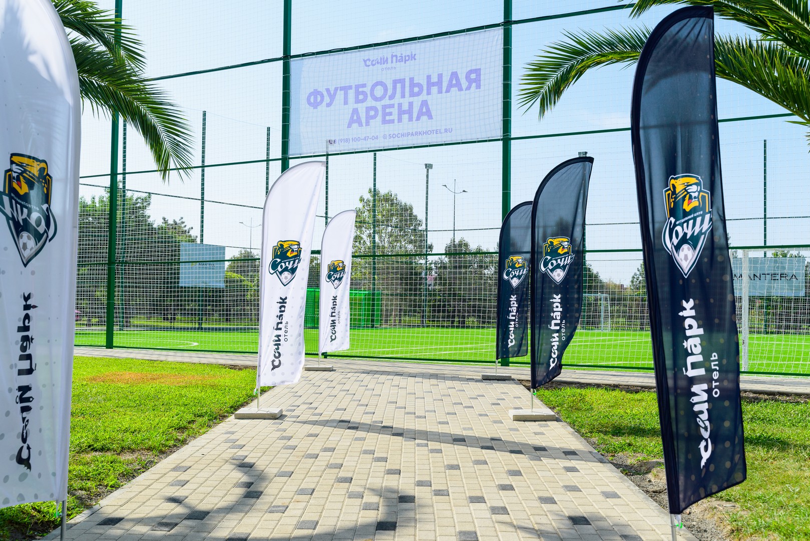 В “Сочи Парк Отеле” состоялась торжественная церемония открытия новой футбольной арены. Игровой комплекс находится между 2-м и 3-м корпусами. Он состоит из двух полей площадью 800 кв. метров каждое, крытых скамеек для запасных игроков, электронного табло.