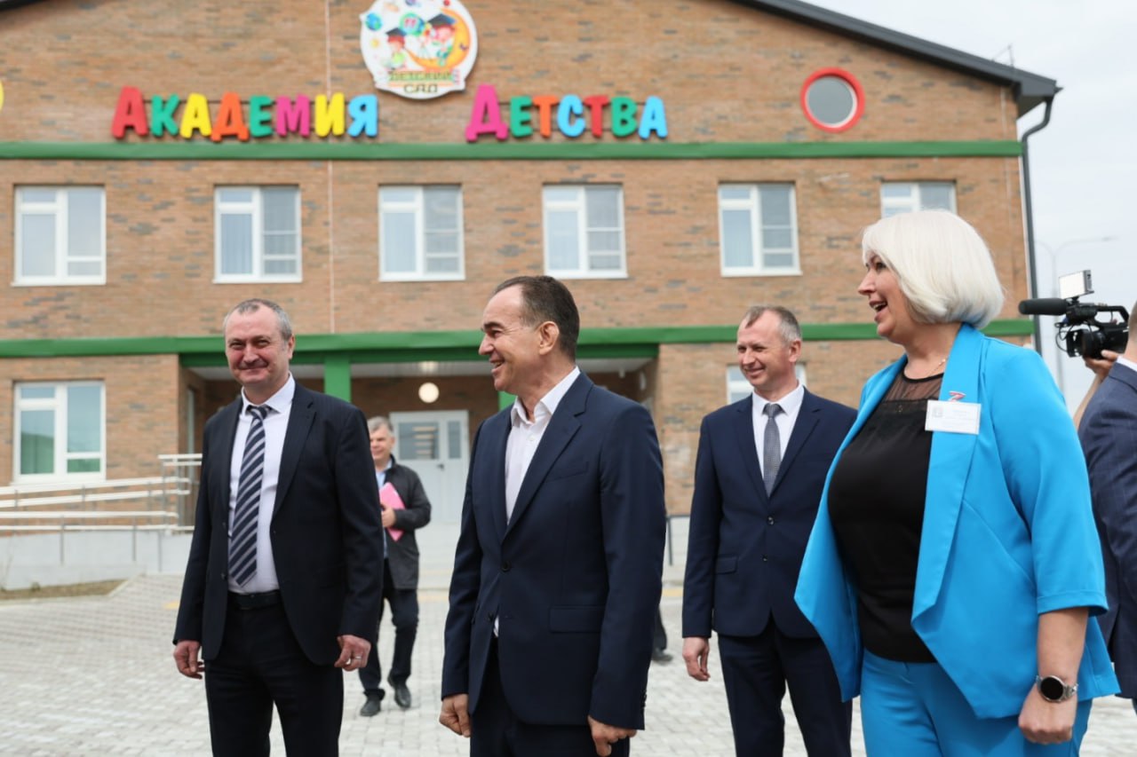 Во время рабочей поездки в Славянский район глава администрации Краснодарского края оценил одно из самых больших в муниципалитете новых дошкольных учреждений – детсад «Академия детства», рассчитанный на 320 мест.