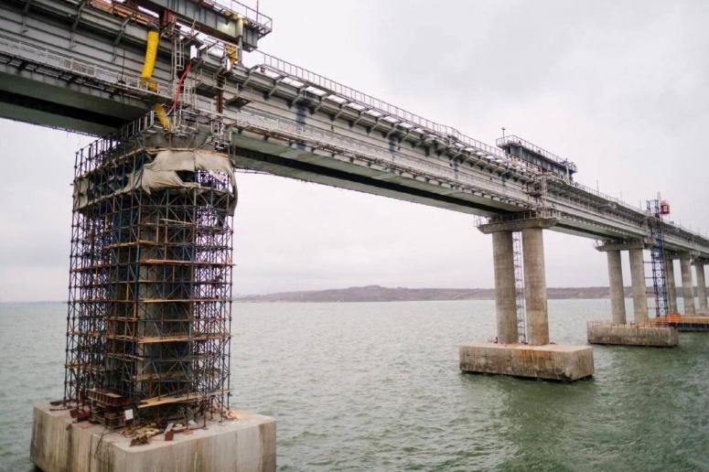 "Сегодня завершен монтаж первого пролета железнодорожной части. После сборки в Керчи с помощью двух барж пролет доставили к мосту и подняли на высоту 27 метров. Трудоемкая процедура заняла два дня", - пояснил он.
