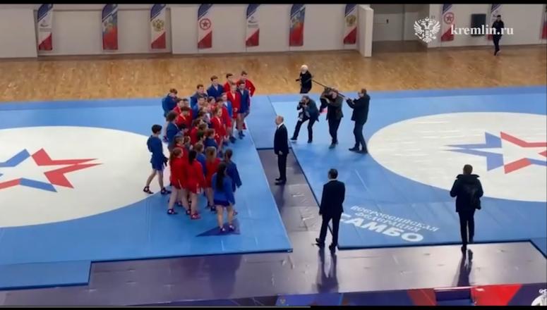 Президент России Владимир Путин сегодня, 7 марта, посетил готовящийся к открытию дворец самбо в Краснодаре. Первым делом он поздоровался с ожидавшими его спортсменами, выстроенными на ковре. Глава государства разрешил детям подойти поближе и пообщался с ними. Затем настала очередь фотографирования.