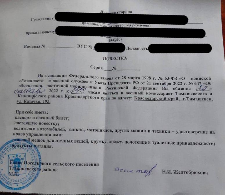 Жителям Поселкового сельского поселения Тимашевского района стали приходить мобилизационные повестки, выписанные главой поселения. Информация об этом появилась в социальных сетях. В сельской администрации пояснили, что повестки были предварительные, а разослали их с целью “заботы о населении”.