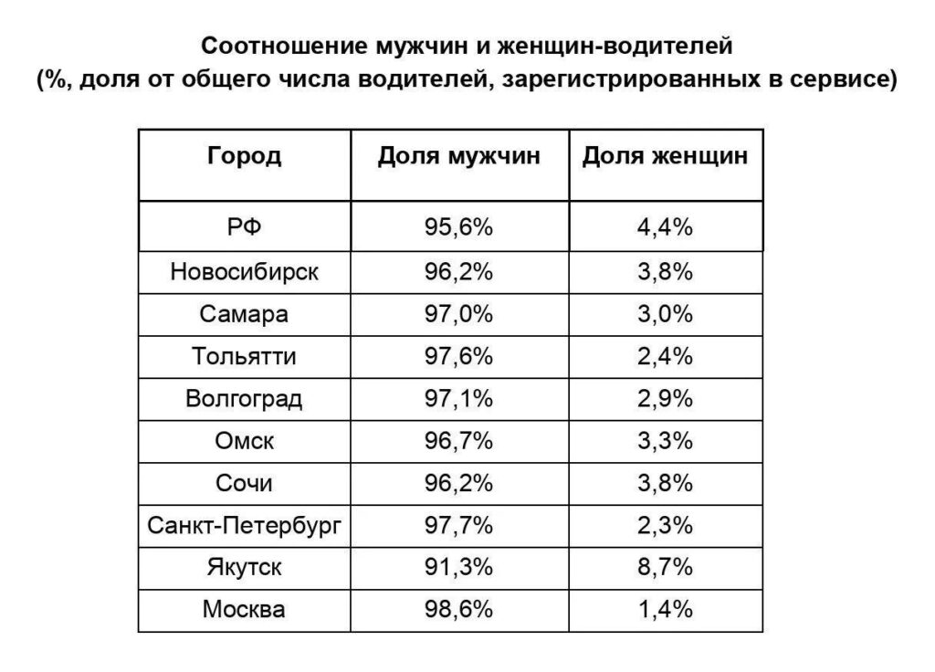 Согласно данным исследования, на сегодняшний день рынок такси по-прежнему остается преимущественно мужским: в целом по стране 95,6% зарегистрированных в сервисе водителей — мужчины, и только 4,4% — женщины. В Сочи эти цифры составляют 96,2% и 3,8% соответственно.