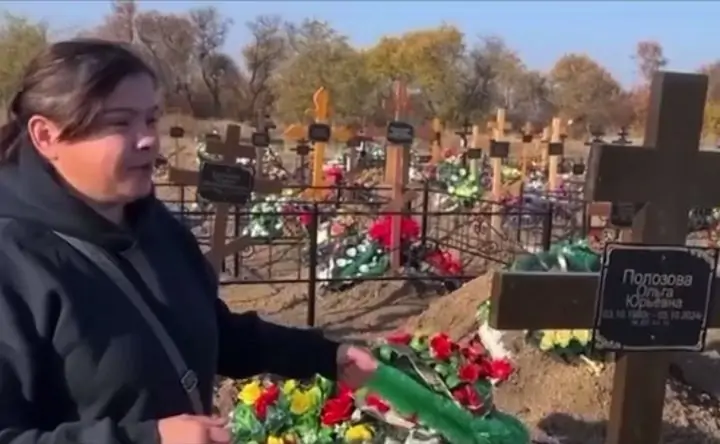 Женщина рядом со «своей» могилой. Скриншот сюжета телеканала НТВ